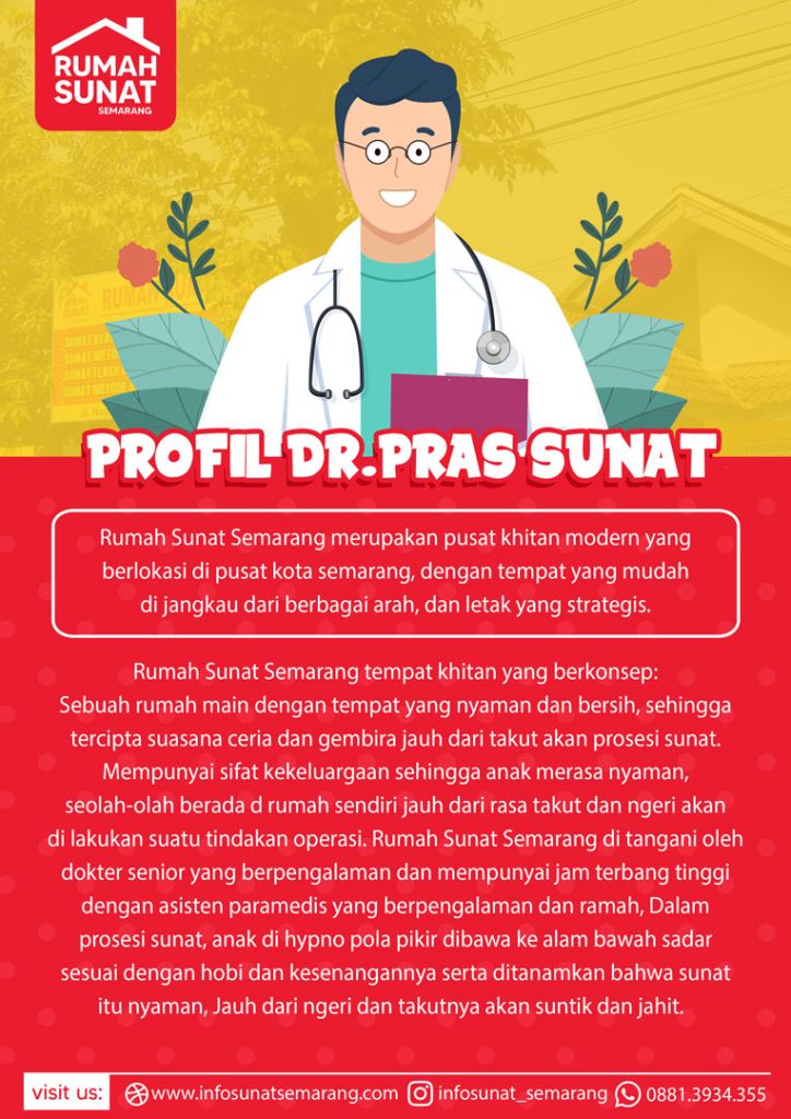 Dokter pras Rumah sunat semarang, jl tlogosari raya 1 no 65 semarang Adalah seorang dokter sunat senior dan handal di kota semarang. seorang praktisi khitan yang expert di bidang sunat modern sejak tahun 90 an, mendedikasikan diri untuk selalu berkiprah di dunia sunat dengan selalu mengedepankan tehnik terbaru dan ternyaman.